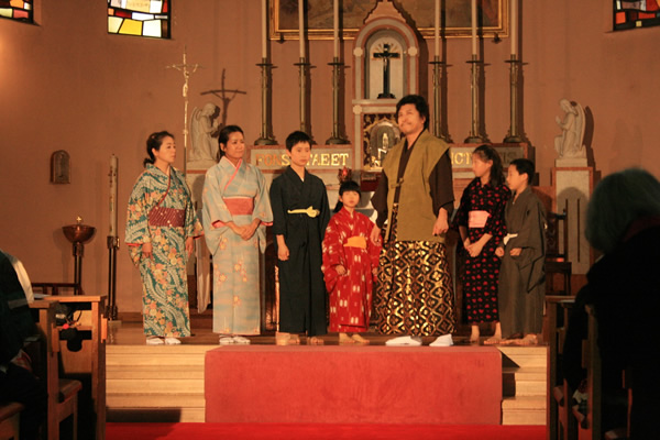 各地で公演を続けている劇団フィオレッティ制作の朗読劇「神の戦士 ユスト高山右近」が上演され、小田信長役で松浦悟郎司教も出演した。『右近フェスタ』は9月に教区事務所で開かれる展示会に引き継がれる。